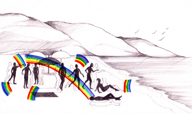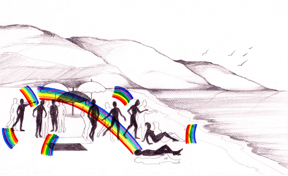 Βρισκόμαστε σε μια παραλία. Μπροστά μας είναι μία πολύ χαρούμενη παρέα τουριστών. Παίζουν κι ευχαριστούνται. Ο κάθε άνθρωπος έχει δίπλα του το περίγραμμά του, γεμάτο και λευκό που πάλλεται. Το ίδιο και όλα τα αντικείμενα. Είναι σαν (σαν;) να βλέπεις δύο κόσμους μαζί. Ανάμεσά τους πολλά ουράνια τόξα κι ένα μεγάλο, που μου προκαλούν την αίσθηση της γιορτής και της χαράς. Διαπιστώνω ότι πράγματι βλέπω δύο κόσμους ταυτόχρονα. Τι ευλογία!
