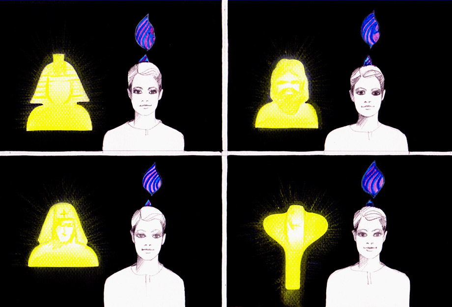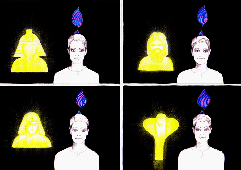 17 Φεβρουαρίου 2002. Κουβεντιάζουμε με τη φίλη. Καθώς την κοιτάζω, βλέπω ότι δεξιά της υπάρχει μία μορφή από χρυσαφί φως. Αρχικά η μορφή θυμίζει Αιγύπτιο Φαραώ (πάνω αριστερά), μετά γίνεται αρχαίος Έλληνας (πάνω δεξιά). Συγκεντρώνομαι συνεχώς βαθύτερα. Το φωτεινό αυτό περίγραμμα παίρνει τη μορφή Ρώσου ή Λιβανέζου μοναχού (κάτω αριστερά) κι ύστερα τη μορφή κόμπρας (κάτω δεξιά). Δεν φοβάμαι καθόλου. Σκέφτομαι σαφώς ότι η κόμπρα είναι σύμβολο. Άλλωστε και όλες οι άλλες μορφές σύμβολα είναι. Ο Δάσκαλος αυτο-περιορίζεται σε αιθερικές μορφές για να γίνει αναγνωρίσιμος από μένα τη συγκεκριμένη στιγμή.