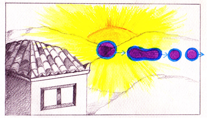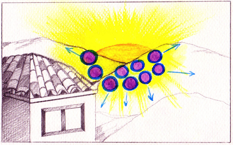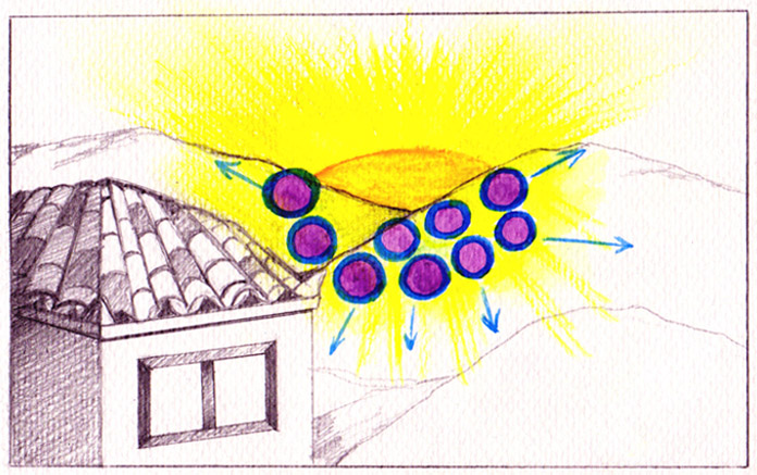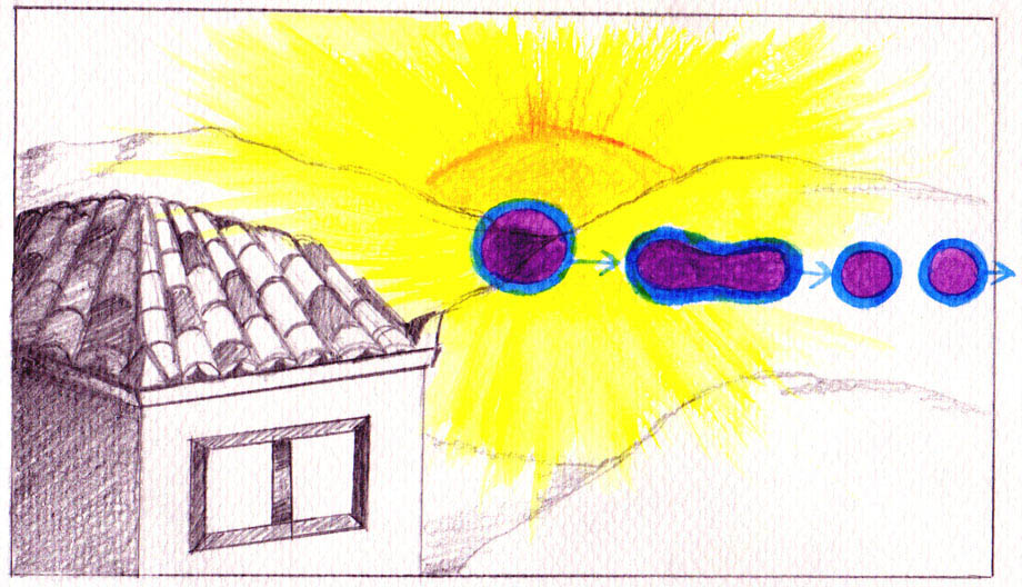 Ανοίγω πάλι τα μάτια και κοιτάζω τον ήλιο να δύει από το ίδιο σημείο. Μωβ σφαίρες με μπλε περίγραμμα εμφανίζονται μπροστά του και κινούνται προς όλες τις κατευθύνσεις, μέχρι που χάνονται (πάνω εικόνα). Τα χρώματα είναι ίδια με εκείνα που έχω δει να φεύγουν από το μέτωπο της φίλης ανάμεσα από τα φρύδια, όταν συγκεντρώνεται και μεταγγίζει ενέργεια σε ανθρώπους, με τη διαφορά ότι από πάνω οι μπάλες είναι κομμένες κάθετα και αποτελούν ημισφαίρια που φεύγουν σε σχηματισμό. Άλλοτε είναι ολόκληρες, αλλά και πάλι έχουν συγκεκριμένο σχηματισμό. Ο ήλιος στέλνει παντού, προς όλους και όλα την ενέργεια. Την ίδια αυτή ενέργεια στέλνει και η φίλη - πώς θα μπορούσε να είναι άλλη, άλλωστε - μόνο που στην περίπτωσή της η ενέργεια κινείται με συγκεκριμένο σχηματισμό γιατί είναι κατευθυνόμενη με συγκεκριμένο σκοπό και προς συγκεκριμένους ανθρώπους.