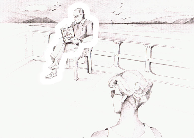 Καθόμαστε στο κατάστρωμα και απολαμβάνουμε τον ήλιο και τον αέρα, κοιτώντας τη θάλασσα. Κάποια στιγμή μού κινεί το ενδιαφέρον ένας συνταξιδιώτης που κάθεται απέναντί μου και διαβάζει ένα βιβλίο. Προσπαθώ να δω την αύρα του. Βλέπω ότι είναι λευκή. Μετά το βλέμμα μου πέφτει στον τίτλο του βιβλίου του: «The sense of being starred at», που σημαίνει «Η αίσθηση του να σε κοιτάζουν»! Δεν μπορώ να πω τίποτ' άλλο παρά ότι το Σύμπαν έχει χιούμορ. Άλλωστε, το Χιούμορ από Εκεί προέρχεται.