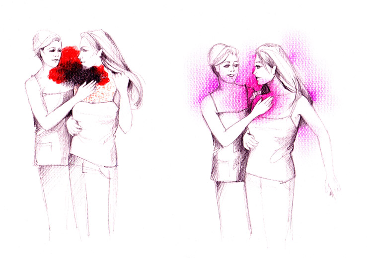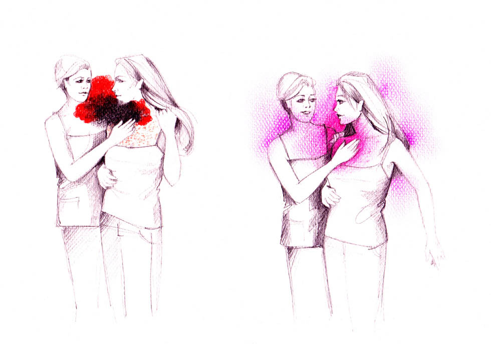 Ιούλιος 2003. Βρισκόμαστε στην εξοχή. Μας επισκέπτεται μια φίλη, η Α., για να κολυμπήσουμε μαζί. Έχει τρομακτικό άγχος κι έχει βγάλει κόκκινα εξανθήματα στο δέρμα της, τα οποία μετά από λίγο αρχίζουν να την ενοχλούν ιδιαίτερα. Η φίλη βάζει τα χέρια της πάνω από τα εξανθήματα της Α. και της μεταγγίζει ενέργεια. Βλέπω ένα σύννεφο, στην αρχή μαύρο και μετά κόκκινο έντονο και αδιαφανές να βγαίνει από εκείνο το σημείο. Στη συνέχεια, ο χώρος γεμίζει μωβ φως. Η Α. που έχει το πρόβλημα χαλαρώνει, διότι ανακουφίζεται και πιστεύει ότι θα της περάσει. Η ενεργειακή θεραπεία συνοδεύεται και από μία δροσιστική αλοιφή. Το άλλο πρωί τα εξανθήματα έχουν μαραθεί και η ενόχληση έχει φύγει.