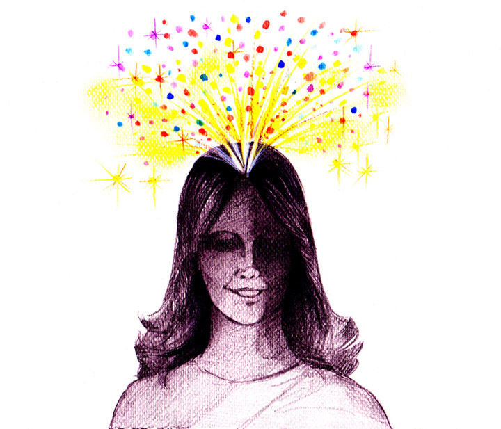 Σεπτέμβρης 2003. Με μια φίλη, την Π., αστειευόμαστε και γενικά έχουμε περιπαιχτική διάθεση. Βλέπω πάνω από το έβδομο ενεργειακό κέντρο της μικρά σφαιρίδια, σχεδόν σαν σημεία, χρυσά, μωβ, μπλε, κόκκινα και πάλι χρυσά, να λάμπουν και να πάλλονται όλα μαζί ταυτόχρονα. Βλέπω κυριολεκτικά τη χαρά της.