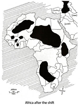 It’s difficult to distinguish the specific effects of an axis shift because so many changes will be taking place in the world. There will be changes world-wide at areas that were unknown to explorers of my time, but are known to you. For instance, they’re not very familiar with Asia, and they don’t know anything at all about Australia or Antarctica. Let’s start from the continent of Africa.