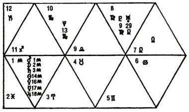 Πρόκειται για έναν πολύ ασυνήθιστο και δυνατό χάρτη που περιγράφει ένα ιδιαίτερο άτομο. Υπάρχει, όπως είπα, έντονη δύναμη σε αυτό το ωροσκόπιο, το οποίο παρουσιάζει μια εξελιγμένη ψυχή που είχε περάσει από «τη δοκιμασία της δύναμης» σε προηγούμενες ζωές και περνά και πάλι από την ίδια άσκηση. Θα χρησιμοποιήσει αυτή την ενέργεια για όλους τους λάθος σκοπούς, στην υπηρεσία του κακού, τη στιγμή που θα μπορούσε να την αξιοποιήσει θετικά. Θα έχει μεγάλη ικανότητα να προβλέπει το μέλλον. Το ωροσκόπιο είναι μέσα σε ένα τετράγωνο και έχει σχόλια με ρόμβους μέσα του. Φαίνεται πως έτσι σχεδίαζαν τα ωροσκόπια εκείνη την εποχή. |
