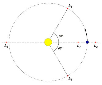 This quatrain refers to the establishment of space stations at the L-5 points in relation to the moon and the Earth. Space travelers must watch out for deep vacuum conditions in space, - «cold, drought, danger around the frontiers.» Regardless of their best preparations, even with the information from the computers, referred to here as the «oracle», they will still be unprepared for unexpected aspects of this environment. The L-5 point is the point between the moon and the Earth where the gravitational pull is equal from both directions. |