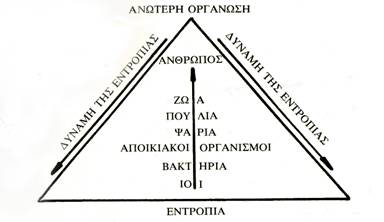 Η φυσική κατωφερής ροή της ενέργειας προς την κατάσταση της εντροπίας μπορεί να ονομαστεί δύναμη της εντροπίας. Μπορούμε τώρα να αντιληφθούμε ότι η «ροή» της εξέλιξης είναι εναντίον της δύναμης της εντροπίας. Η διαδικασία της εξέλιξης υπήρξε μια ανάπτυξη των οργανισμών από τις κατώτερες στις ολοένα ανώτερες καταστάσεις συνθετότητας, διαφοροποίησης και οργάνωσης. Ένας ιός είναι ένας εξαιρετικά απλός οργανισμός, λίγο περισσότερο από ένα μόριο. Ένα βακτηρίδιο είναι πιο σύνθετο, πιο διαφοροποιημένο, που έχει ένα κυτταρικό «τείχος», και διάφορους τύπους μορίων και μεταβολισμό.