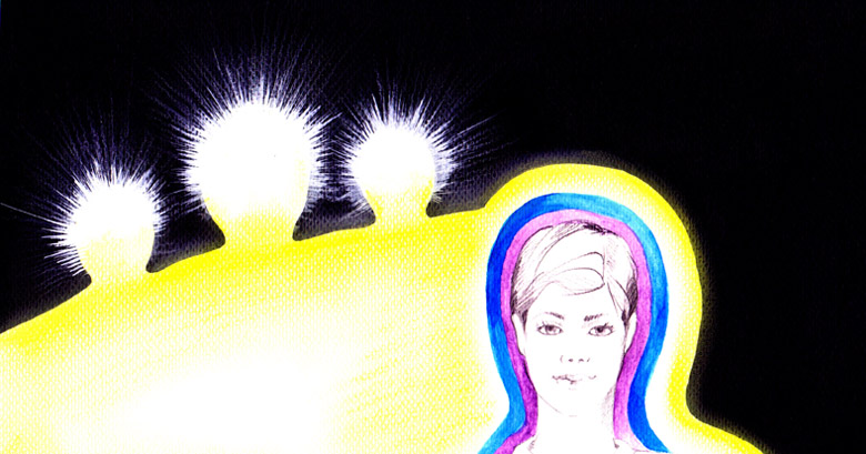 Suddenly, I saw something that I observed for the first time and it made quite an impression to me. On her right, and completely separate from her, I noticed the outlines of three bodies made of platinum light. It was clear that they were ethereal forms. The middle one was a little bigger. We can say that they stood still, shoulder to shoulder and were looking at us. I felt the need to welcome them.