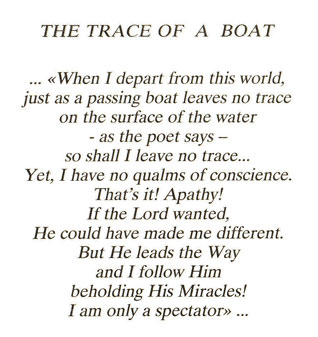 At the end of the day you ask yourself: "Who am I? Of all these people, who am I?" No one! I am no one"! How funny! Then I say: "Let me behold Christ, even if I do not exist! What do I care about my existence"... I said that once, twice, three times... People ask me: "Are you cold"? Who is cold? How can I feel cold, since I do not exist! "Are you hungry"? Who is hungry? How can I feel hungry since I do not exist! "Does pollution affect your health"? How, since I do not exist! Well, they thought I was a little off my mental balance..."